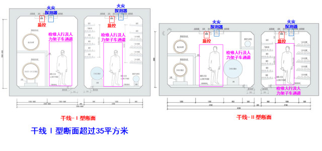 一般设置于道路中央下方或道路红线外综合管廊带内,主要输送原站(如自来水厂、发电厂、燃气制造厂等)到支线综合管廊,其一般不直接服务沿线地区。其主要收容的管线为电力、通讯、自来水、燃气、热力等管线,有时根据需要也将排水管线收容在内。在干线综合管廊内,电力从超高压变电站输送至一、二次变电站,通讯主要为转接局之间的信号传输,燃气主要为燃气厂至高压调压站之间的输送。干线综合管廊的断面通常为圆形或多格箱形,综合管廊内一般要求设置工作通道及照明、通风等设备。干线综合管廊的特点主要为:稳定大流量的运输、高度的安全性、内部结构紧凑、兼顾直接供给到稳定使用的大型用户、一般需要专用的设备、管理及运营比较简单。