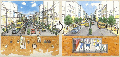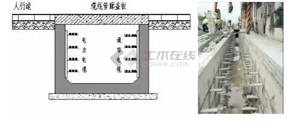 主要负责将市区架空的电力、通讯、有线电视、道路照明等电缆收容至埋地的管道。一般设置在道路的人行道下面,其埋深较浅,一般在1.5米左右。以矩形断面较为常见,一般不要求设置工作通道及照明、通风等设备,仅增设供维修时用的工作手孔即可。