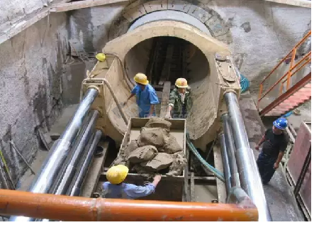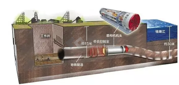使用盾构在地中推进,通过盾构外壳和管片支撑四周围岩,防止发生隧道内的坍塌,同时在开挖面前方用刀盘进行土体开挖,通过出土机械运出洞外,靠推进油缸在后部加压顶进,并拼装预制混凝土管片,形成隧道结构的一种机械化施工方法。